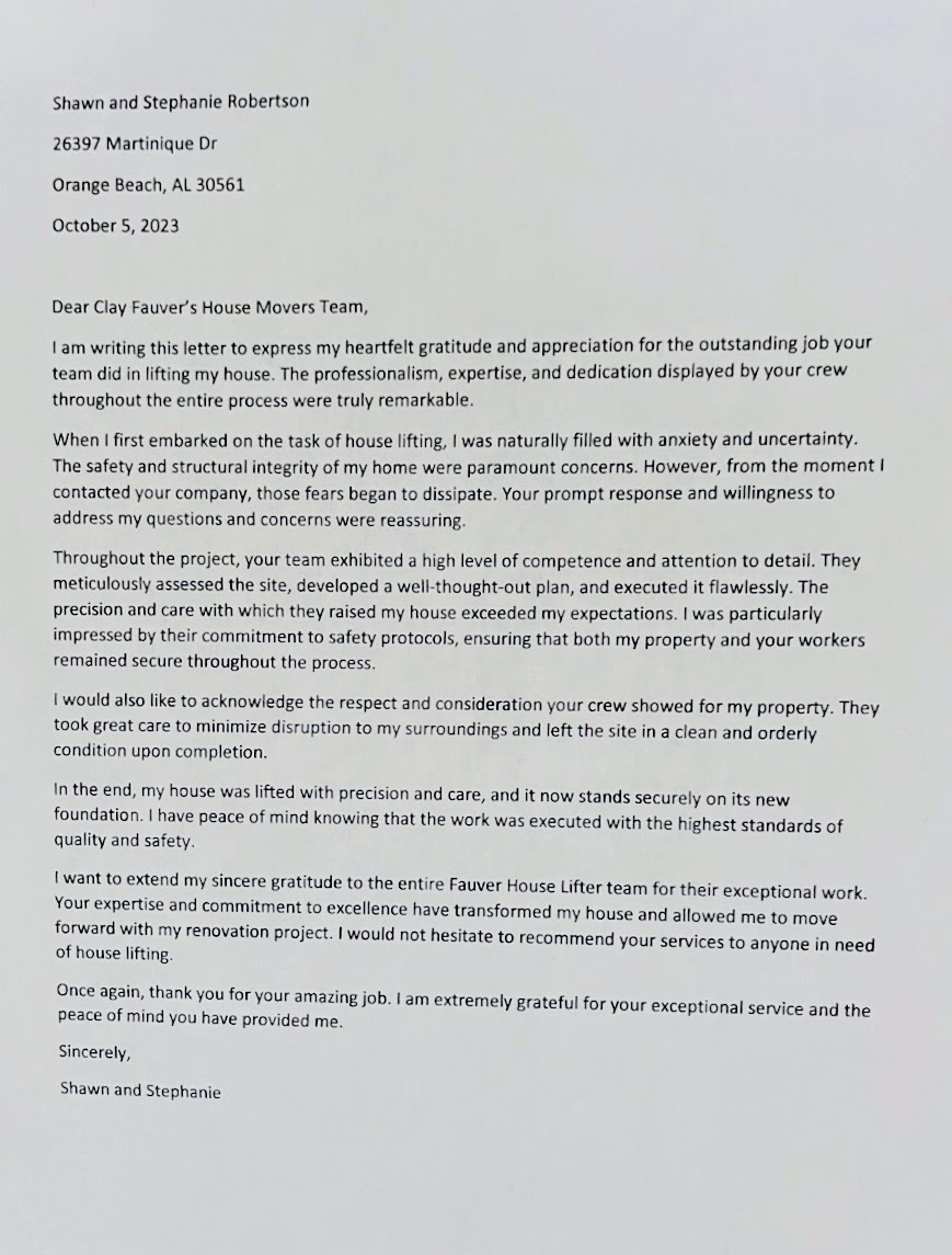 BY CLAY FAUVER'S HOUSE MOVERS & LEVELING CO., INC / 9901 MOUNTAIN LAUREL DRIVE, SEMMES, AL 36575 OFFICE PHONE 251-649-1012 / CELL 251-331-4598 / EMAIL: [email protected] PRIVACY POLICY